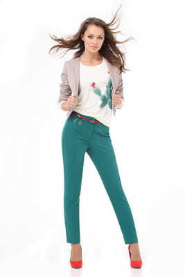 Укороченная приталенная куртка из кожи с выстеганной фигурными строчками планкой по горловине и низу рукава и застежкой на кнопку. Узкие брюки из костюмной ткани актуального изумрудного цвета со стильной вышивкой. Молочный вискозный топ с ярким принтом в виде цветущего кактуса с объемными цветами из шифона