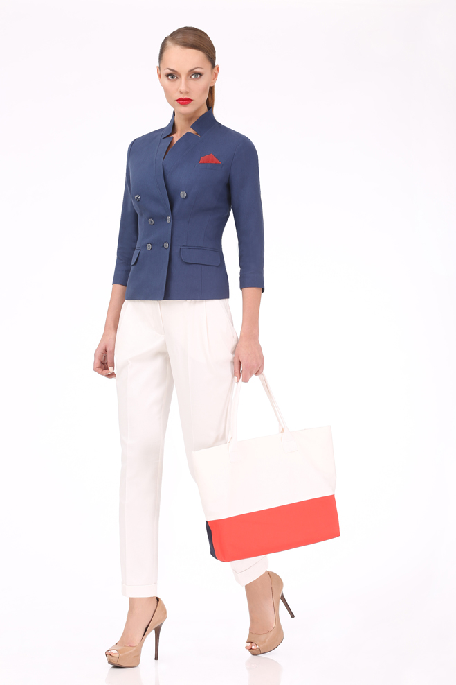 Прилегающий двубортный жакет из льна с оригинальным решением воротника и лацканов. Карманы с клапанами, рукав 3\4 с манжетой.