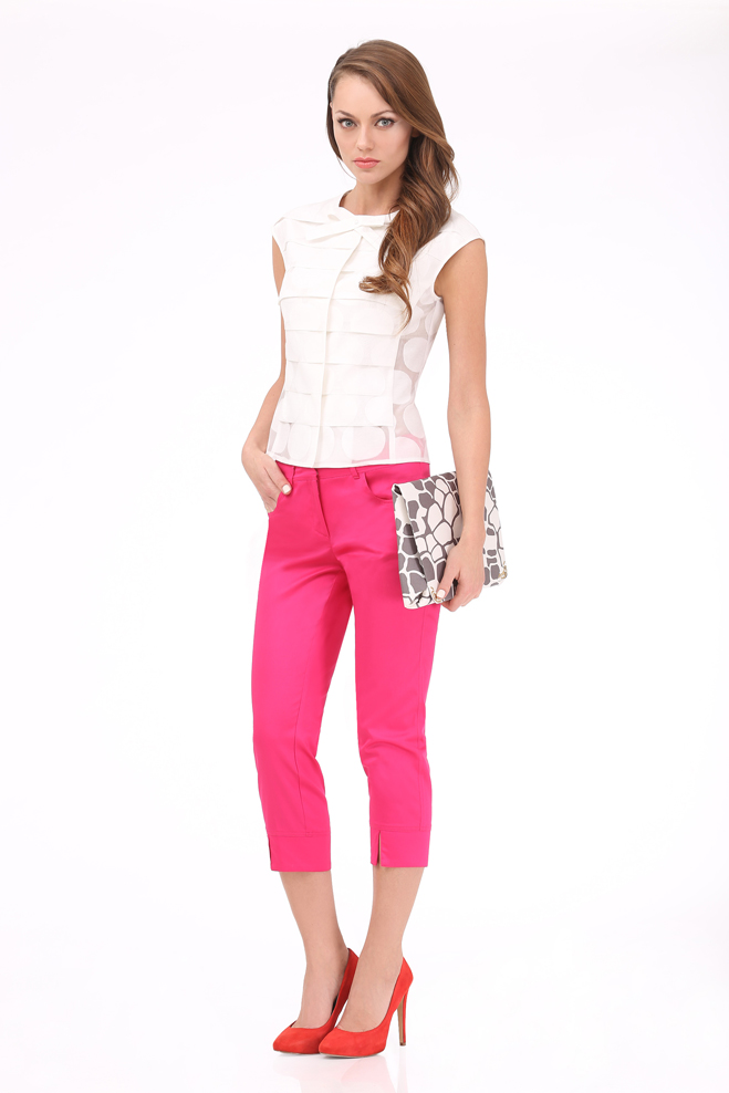 Зауженные брюки-капри из костюмного хлопка с аталсным блеском длиной 7\8, с джинсовыми карманами и вертикальными разрезами на манжетах по низу.
