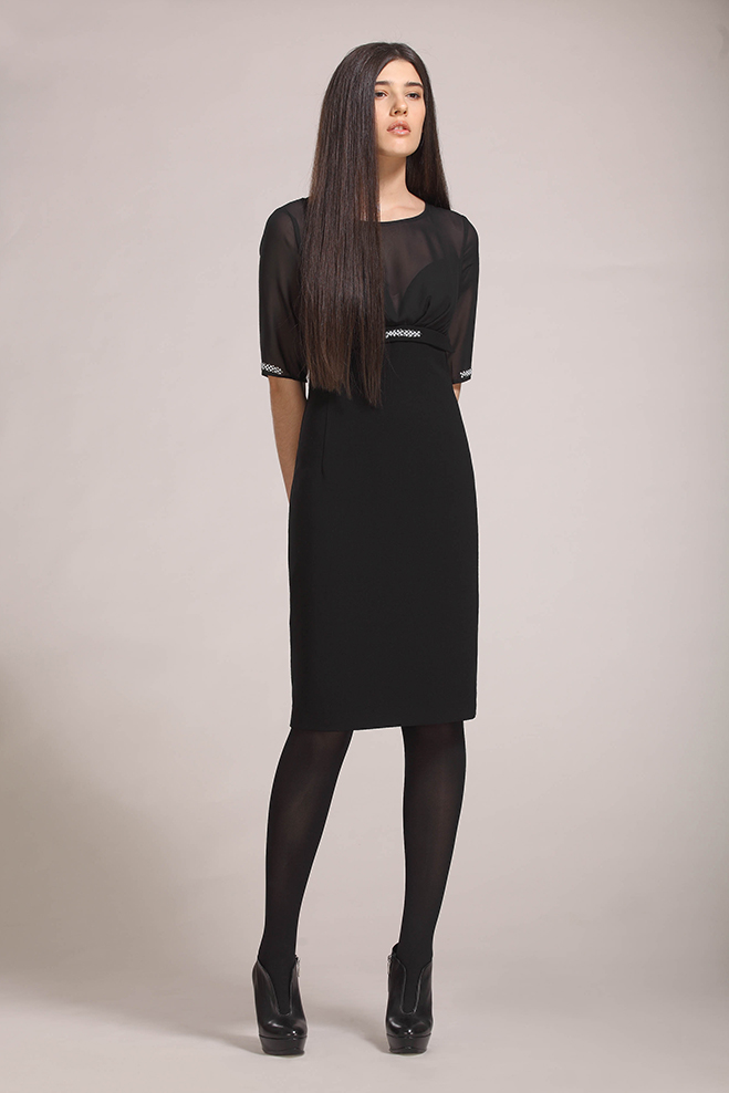 Полуприлегающее платье длиной до колен. Фигурный лиф. Кокетка и рукава из шифона. Декор жемчугом по низу рукавов. Трикотажная подкладка.