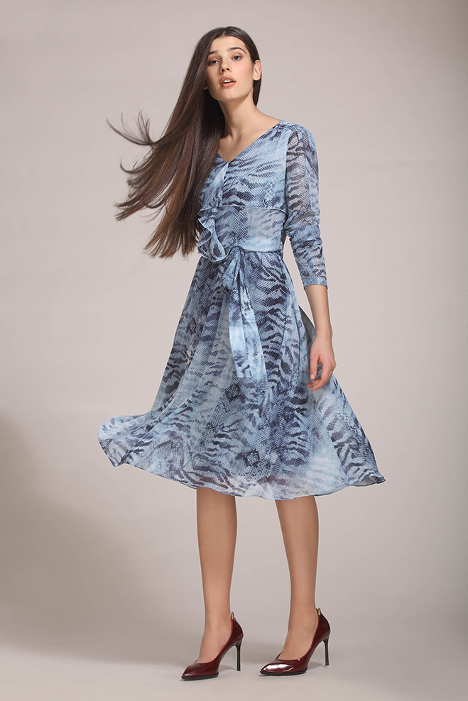 Приталенное платье длиной за колено. На лифе волан. Расклешенная юбка.