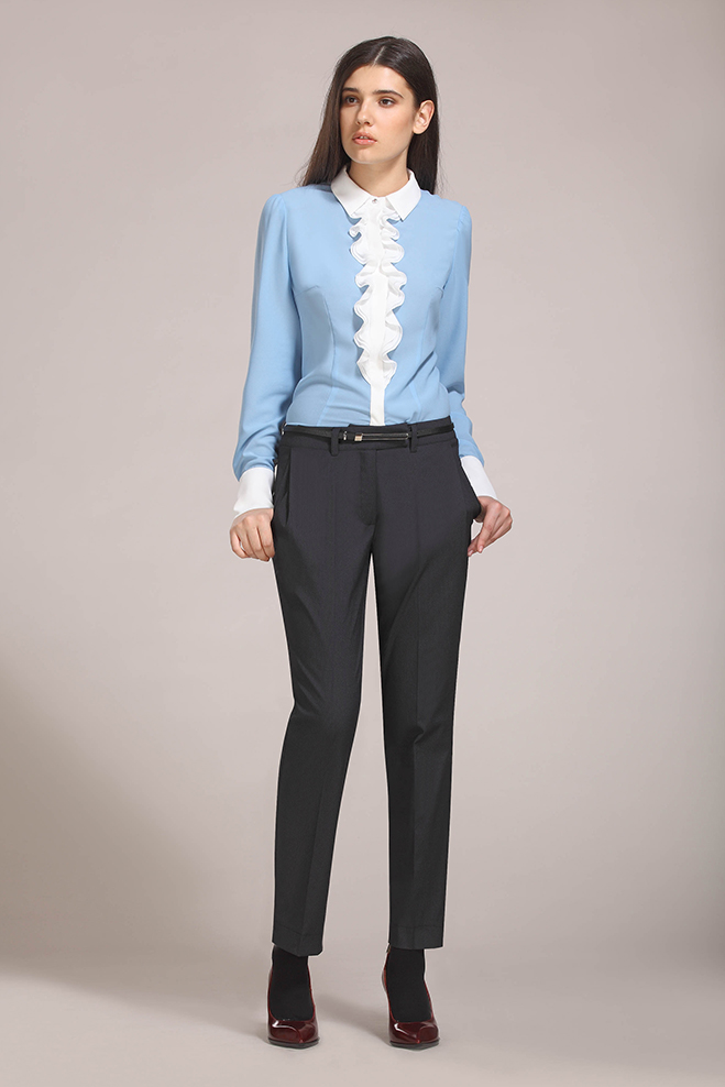Прямые, слегка зауженные брюки со складками у пояса. Боковые карманы.