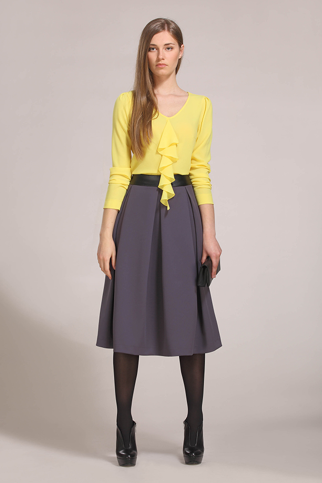 Расширенная юбка со складками длиной ниже колена. Кожаный пояс. Жаккардовая подкладка.