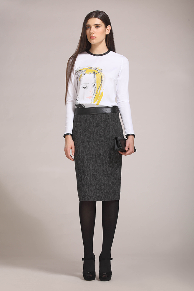 Юбка-карандаш длиной до колена. Кожаный пояс. Жаккардовая подкладка.