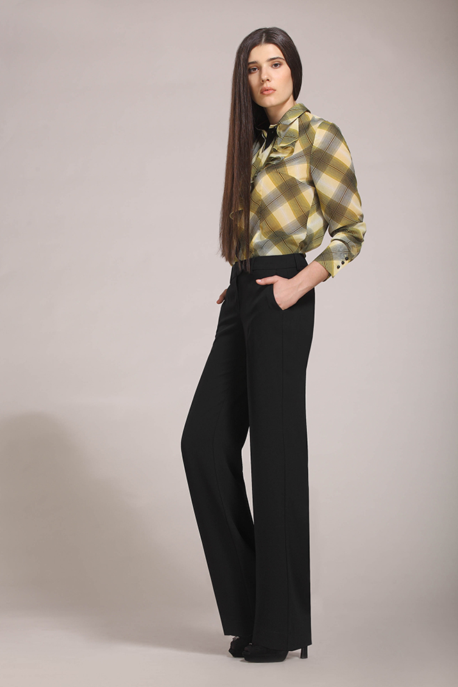 Свободная блузка. Жабо спереди вдоль горловины и застежки. Длинный рукав с манжетой.