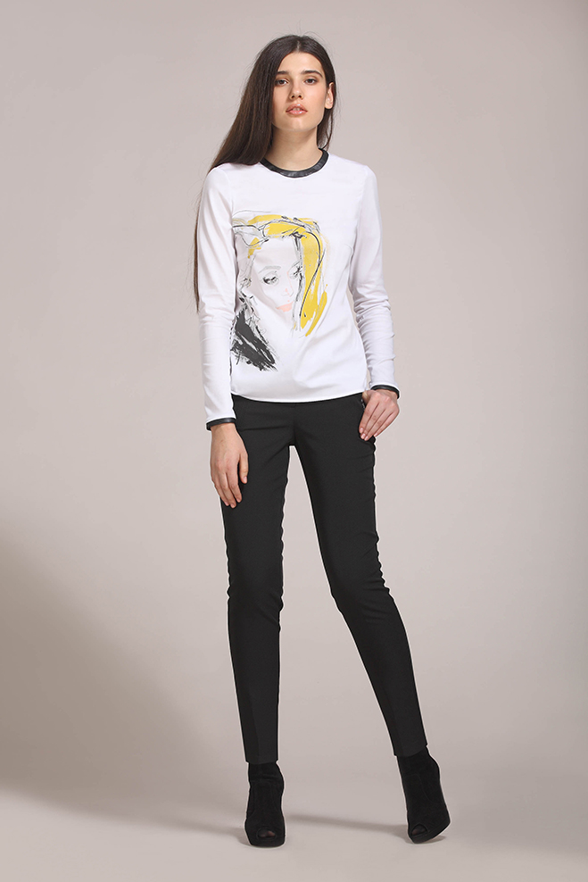 Полуприлегающая блузка с печатью. Застежка на спинке на пуговицы. Длинный рукав. Кожаная отделка горловины и низа рукавов.